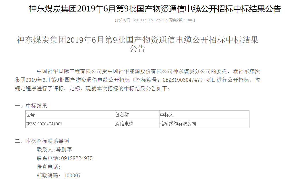 點擊數:64002019-11-21 00:00:00 來源: 神東煤炭集團2019年6月第9批國產物資通信電纜公開招標中標結果公告